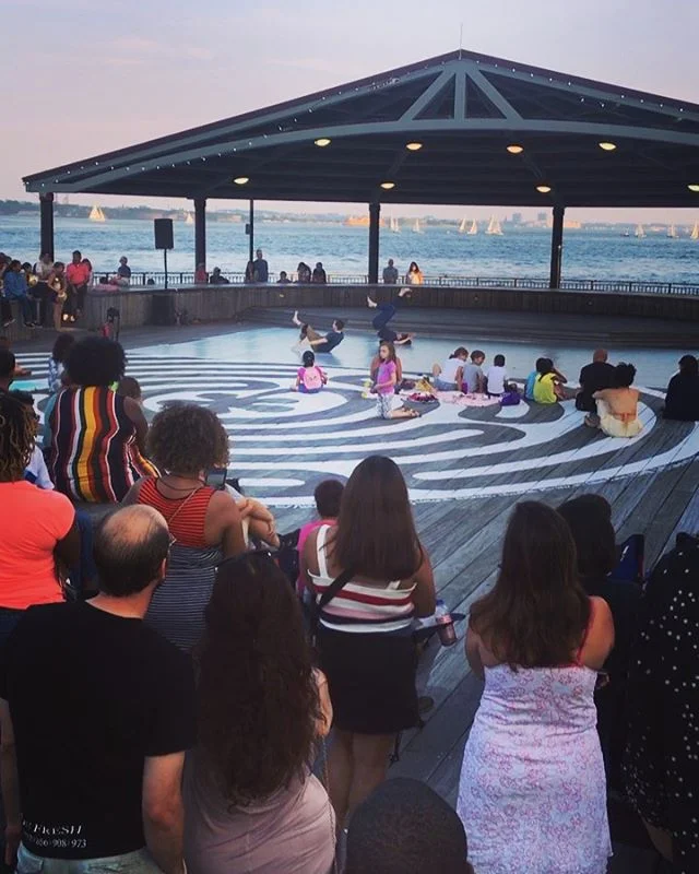 Welcome to Labyrinth [No. 9]! This artwork was created for Jersey City and is the original design of local artist Katelyn Halpern. To enjoy the labyrinth in a traditional way, walk the path starting at the mouth, follow it to the center, and then follow it back out. Unlike mazes, labyrinths are a single twisting pathway without dead ends, forks, or tricks. There are no choices to make - simply things to notice. You may give yourself over to the path and release your mind to its wanderings, or perhaps carry with you a question, idea, or feeling, and watch how it changes as you move along.